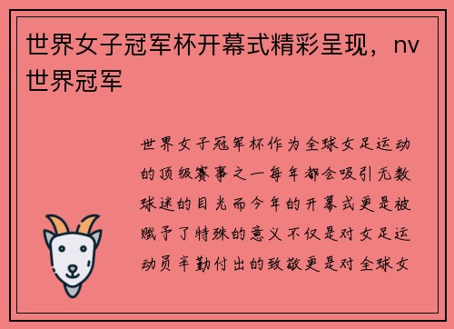世界女子冠军杯,作为全球女足运动的顶级赛事之一,每年都会吸引无数球迷的目光。而今年的开幕式更是被赋予了特殊的意义——不仅是对女足运动员辛勤付出的致敬,更是对全球女足运动发展的巨大推动。