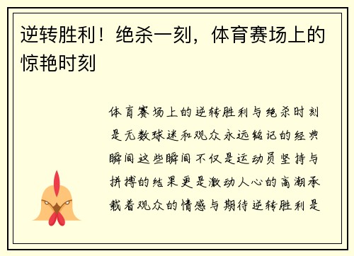 体育赛场上的逆转胜利与绝杀时刻是无数球迷和观众永远铭记的经典瞬间。这些瞬间不仅是运动员坚持与拼搏的结果,更是激动人心的高潮,承载着观众的情感与期待。逆转胜利,是在看似不可能的情况下,通过顽强的努力与决不放弃的精神,最终扭转局势的胜利。绝杀时刻,则是在比赛即将结束时,凭借一记精彩的进攻或关键性的操作,瞬间改变比赛结果的瞬间。无论是足球、篮球、网球还是其他任何一项体育赛事,逆转和绝杀总能激起观众的强烈情感,成为赛事的亮点与传奇。本文将从四个方面详细阐述体育赛场上逆转胜利与绝杀时刻的惊艳表现:它们是如何塑造英雄,如何激发团队合作的精神,如何体现体育精神的本质,以及它们对观众与社会的深远影响。