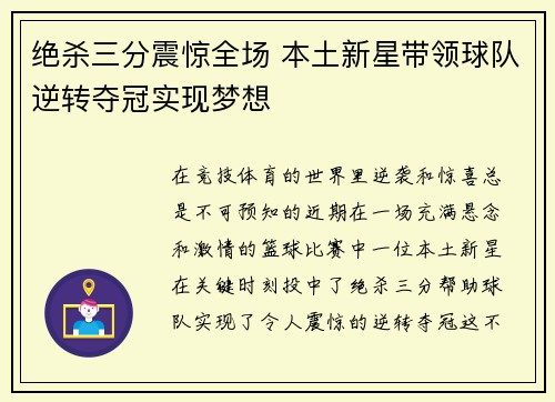 在竞技体育的世界里,逆袭和惊喜总是不可预知的。近期,在一场充满悬念和激情的篮球比赛中,一位本土新星在关键时刻投中了绝杀三分,帮助球队实现了令人震惊的逆转夺冠。这不仅仅是个人的荣耀,更是对整个团队和球迷信念的极大回报。本文将详细回顾这场比赛,从多个方面分析这位年轻球员如何一步步带领球队逆袭,并最终实现了他们的梦想。我们将从四个方面进行探讨:一是比赛的高潮时刻——绝杀三分;二是本土新星的成长历程与重要性;三是球队的团队合作与策略调整;四是这场胜利对球队和球员未来的意义和影响。通过这些方面的详细分析,我们将全面了解这场比赛背后的精彩与深远意义。