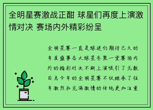 全明星赛一直是球迷们期待已久的年度盛事,各大球星齐聚一堂,赛场内外的精彩对决不断上演,吸引了无数目光。今年的全明星赛不仅继承了往年激烈和充满激情的传统,更加注重娱乐性和观赏性,使得这场赛事成为了球迷和媒体热议的焦点。在这场比赛中,球员们不仅展现了自己超高的竞技水平,更通过精彩的扣篮、传球以及高难度的配合,为观众带来了一场视觉盛宴。全明星赛的赛场内外,无论是球场上的对抗还是球迷们的欢呼,都形成了一个充满活力与激情的盛大庆典。本篇文章将从全明星赛的赛场表现、球星之间的对决、场外娱乐活动和球迷互动四个方面,详细解析这场赛事的精彩纷呈,带你回顾这一激烈的篮球盛会。