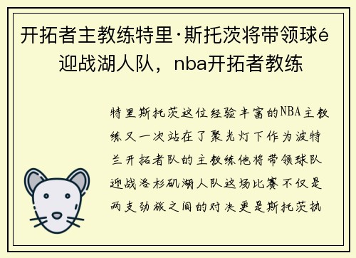 特里·斯托茨,这位经验丰富的NBA主教练,又一次站在了聚光灯下。作为波特兰开拓者队的主教练,他将带领球队迎战洛杉矶湖人队。这场比赛不仅是两支劲旅之间的对决,更是斯托茨执教能力的一次重要检验。