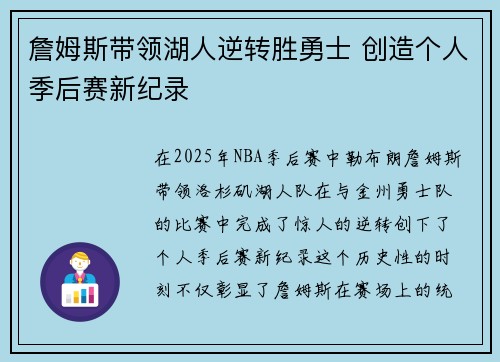 詹姆斯带领湖人逆转勇士,创造个人季后赛新纪录,是一场典型的“超级巨星”主宰比赛的例子。从个人表现到团队合作,再到战术调整,詹姆斯的全方位能力都在这场比赛中得到了充分的展示。这不仅是一场普通的季后赛胜利,更是詹姆斯作为一位篮球巨星智慧与能力的集中体现。无论是对湖人队的未来,还是对詹姆斯个人的职业生涯,这场比赛都具有深远的影响。