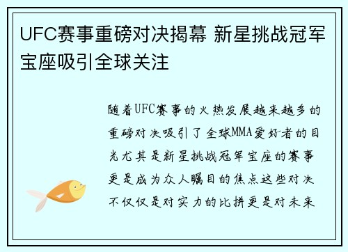 随着UFC赛事的火热发展,越来越多的重磅对决吸引了全球 MMA 爱好者的目光,尤其是新星挑战冠军宝座的赛事,更是成为众人瞩目的焦点。这些对决不仅仅是对实力的比拼,更是对未来格斗天才的期待。本篇文章将围绕UFC赛事中的“新星挑战冠军宝座”的重磅对决进行详细阐述。从赛事的背景、赛事的关键人物、新星挑战的意义以及全球关注的原因四个方面,深入分析为何这类赛事能够吸引如此高的关注度。通过对这些方面的探讨,我们可以更清楚地看到,UFC赛事不仅仅是体育竞技,更是文化和娱乐的深度融合,成为全球体育迷的狂欢。