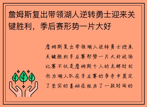 詹姆斯在复出的比赛中展示了他的全面能力,带领湖人队完成了从落后到逆转的精彩过程。这一场比赛不仅对湖人队本赛季的季后赛形势起到了至关重要的作用,也证明了詹姆斯依旧是联盟中的顶级球员。他的复出让球队重新看到了夺冠的希望,球迷们也对接下来的季后赛充满期待。