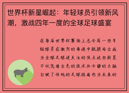 在每届世界杯赛场上,总会有一些年轻球员在激烈的角逐中脱颖而出,成为全球足球迷关注的焦点。这些新星不仅凭借出色的技术和冷静的头脑打破了传统的足球格局,也为未来的足球赛事带来了无限的期待。近年来,年轻球员的崛起趋势愈加明显,他们在世界杯赛场上所展现的实力,已不再局限于个人技巧的展示,而是更为全面的综合表现。从技术风格到心理素质,再到他们的职业生涯规划,年轻球员已经成为世界杯赛事中的新风潮。这篇文章将从多个方面深入分析世界杯新星崛起的现象,探讨他们如何引领这股足球界的新风潮。